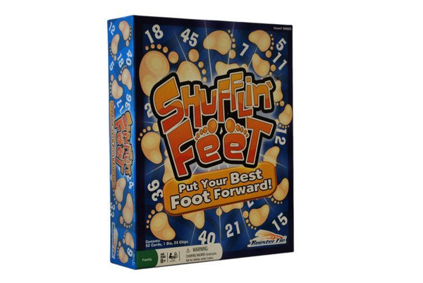 Shufflin’ Feet is the funny game that takes unexpected twists on every turn! The players compete to win chips by playing higher valued cards than their opponents. On every round players place one card down in front of them and pick a player to roll the cube. The cube has three number sides and three action sides. If a number is rolled, players bet that number of chips, flip the card in front of him/her and the highest valued card wins the chips. Actions consist of trade, slide, and chip. Each action moves cards around the table to an opponent. If an action is rolled, complete the action and pass the cube to the next player. Play stops when a number is rolled. Quick wits and a little luck can leave any player in position to win on any turn. It depends on which direction the feet shuffle!