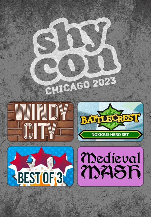 A 18-card wallet compilation of 4 Button Shy games, delivered at ShyCon Chicago 2023:
