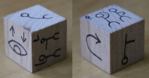 One player takes the role of the master, rolls the two dice, and reads aloud the results. The other players try to obey those instructions. If anyone can't obey the instruction, doesn't obey it, or falls over while trying then they are eliminated. The last person standing becomes the master for the next game.