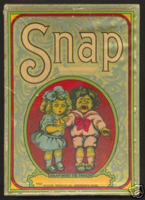 Published in 1905 by Milton Bradley (catalog #4384). Game is played with a deck of 40 color lithographed cards depicting various comical scenes. The object of the game is to "capture" all of the cards, this is done in the following manner.
