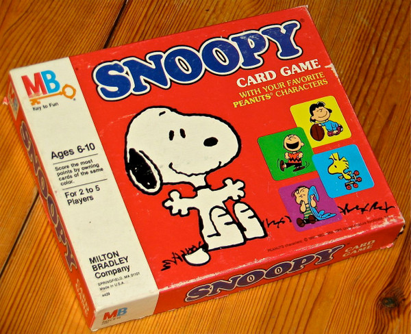 Snoopy Card Game "With Your Favorite Peanuts Characters" consists of character cards from Charles Schulz's Peanuts comic strips: Charlie Brown, Lucy, Linus, Woodstock and, of course, Snoopy; each character card has a different color background. Players are dealt four cards, which they then play in turn, one at a time, on the gameboard, a 5 x 5 grid. At different points in the game, players claim ownership of a row and a column and, when all spaces are filled, score for their color combinations.