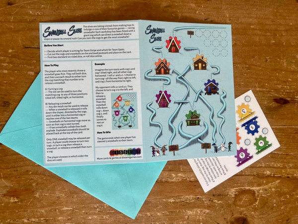 Snowball Slide is a game which is also a Christmas card. On the front of the card is a picture, while on the back the rules are laid out neatly. Inside each is a small piece of card with eight counters to cut out and use with the game. It’s a two player game which takes around five minutes to play.