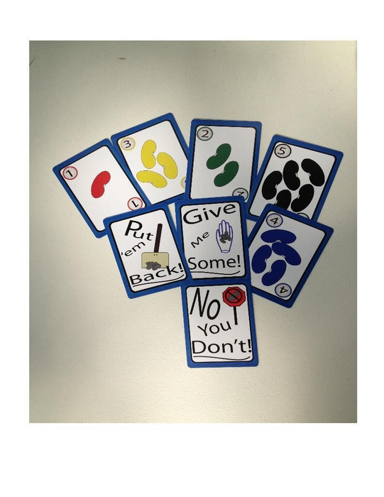 Som' Beans is a fun, fast card game for 2 to 4 players with a simple object: End the game with the most beans. What is involved in the game are a bag with 100 beans and a deck of 54 cards. Each player is dealt 6 cards and one player grabs out a handful of beans from the bag. From there players take beans from the pile, put them back, or take from other players. Once the last bean is taken by exact count, a player pulls out some more beans and the next round begins. When the bag is empty and the last bean is taken, count up. The most beans wins. Games take approximately 15 minutes.