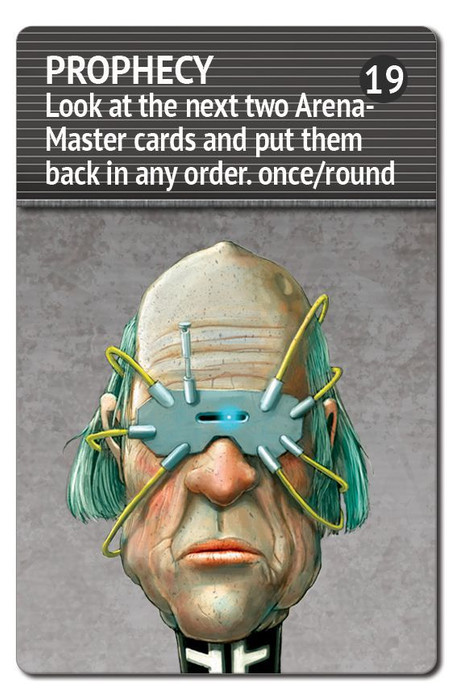 The 19th Head: Prophecy has a once per round ability. It allows the player to look at the next two Arena Master cards and lets them put the cards back in any order.