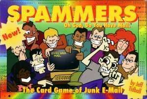 You play scam cards in front of you (up to 5) and then play mail-out cards (spams) trying to lure people in. There are a number of mailing lists of various sizes in the middle for anyone to mail to, plus each player has some private mailing lists that only they can spam. The action is to play a 'mail' card, nominating both a scam and the list that you're mailing the scam offer to. If you roll a d6 less <= the size of the list, you succeed, and that scam scores a point. If you roll way under (4 or more), your scam scores 2 points. Some lists specialize in one of the 4 scam types ... if your scam and the list matches, you get a modifier of +2 making it easier to score, plus the mail-out cards have modifiers between 0 and +5.