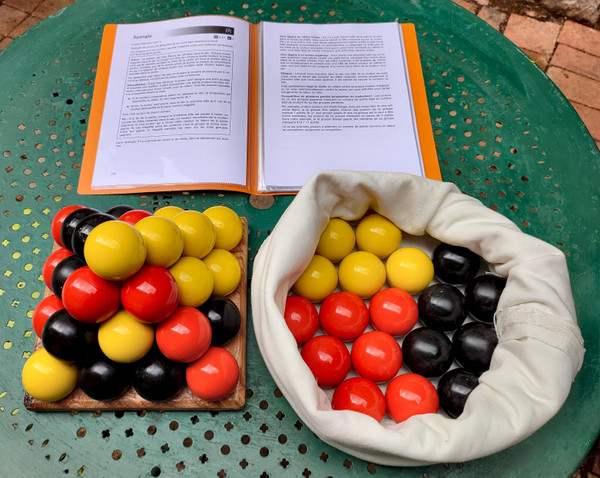 Spangle is a deduction game for 4-10 players that can be played with a Series: Shibumi set. It uses a 4×4 set of stacking spheres in 3 colors.