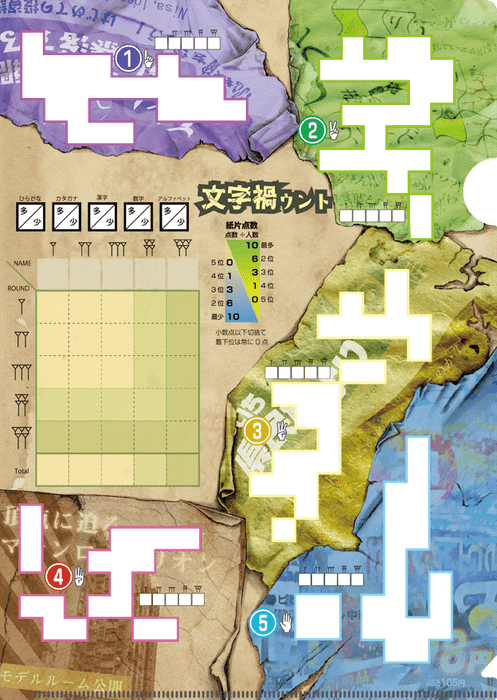 æåç¦ã¦ã³ã (Mojika unto) (Spell count) is an unusual word game from Japan that uses leaflets and flyers which would be thrown away. The game has an A4 plastic file sleeve with a print design (a very common item in Japan). The design has 5 clear windows of different shapes. The players insert an A4 sheet from a pamphlet, catalogue or flyer into the sleeve, and predict which window will show the most characters of one type. For example, which will show the most Katakana characters, or the most numbers. Players with the best or worst guesses score or lose points in the game.