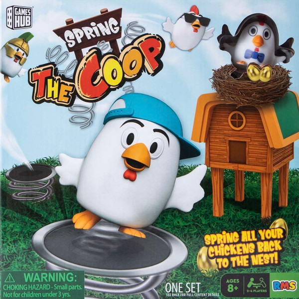 Get ready to launch into fun with Spring the Coop! This hilarious and fast-paced action game is perfect for 2 to 4 players, ages 8 and up. Your mission? Spring all your chickens back into the nest! Players use mini trampolines to bounce quirky chicken characters – each with their own unique look. Successfully spring chickens into the coop to earn golden eggs … the player with the most eggs at the end of the game wins!