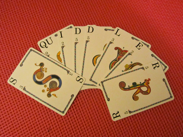 Players draw two cards and discard one with the goal of forming one word of at least 7 letters and all other cards in hand (if any) forming a word or words of at least 3 letters each. Using the colorful alphabetical card deck published to play Quiddler ("The Short Word Game"), Squiddler is for players who enjoy a challenge with longer words. The name of the game is a portmanteau word combining "Seven" and "Quiddler."