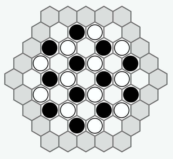 The first player to move all of the pieces on the board adjacent to each other or to prevent the opponent from moving wins the game.