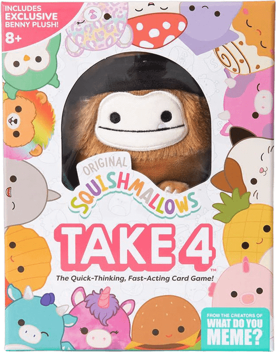 Your mission is to gather 4 cards from the same Squishmallows Squad. But watch out—if you try to grab the same one as another player, you both have to race to grab the mini Benny The Bigfoot in the center in order to claim the card.