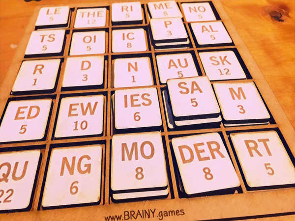 This lasercut wooden game comes with a set of 170 tiles comprising one-, two- and three-letter word fragments along with a 5x5 stacking grid. These bigrams and trigrams are the most common in the English language.