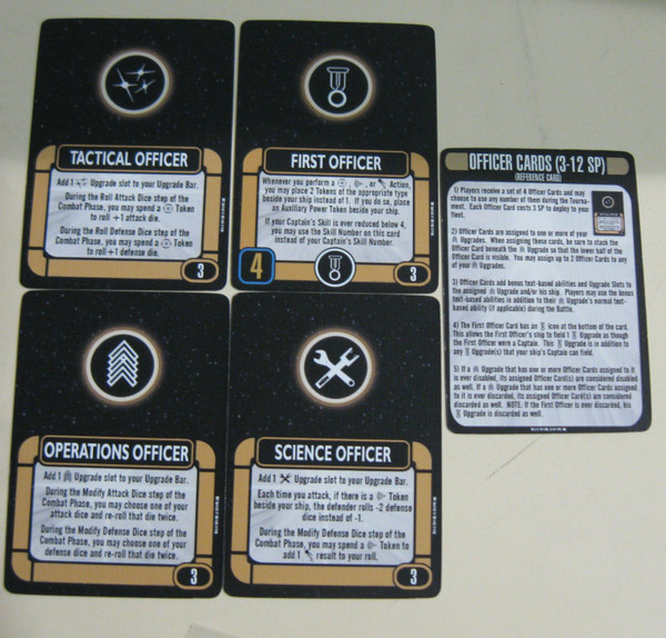 The Officer Cards are a participation prize given to players who participated in Month 3, "Battle of Sector 001," of the Star Trek: Attack Wing Storyline Organized Play Event, The Collective. It is considered a Resource, and costs 3 Squadron Points per officer (up to 4 officers).