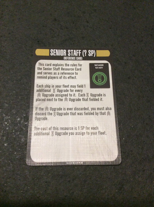 The Senior Staff Resource is a participation prize given to players who participated in the "Yesterday's Enterprise" episode Organized Play Event. It is considered a Resource, and costs a variable number of Squadron Points.