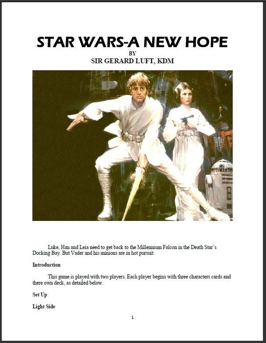The game is played on the map from the Escape From the Death Star miniature game, or the players may design a custom map. The object of the game is to destroy all of your opponent’s characters. Each player controls three characters. The Rebel player plays Luke Skywalker, Princess Leia, and Han Solo. The Empire player plays Darth Vader, an anonymous Stormtrooper, and (from the Episode III cutting room floor?) Boba Fett.