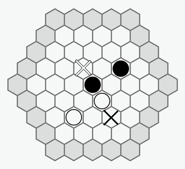 Stoic is a placement game with simple rules. There are many abstract games in which you capture your opponent's pieces by sandwiching them between your pieces, but in this game, you cannot place a piece in a position where one of your opponent's pieces is sandwiched between two of yours. The player who cannot place a piece in their turn loses.