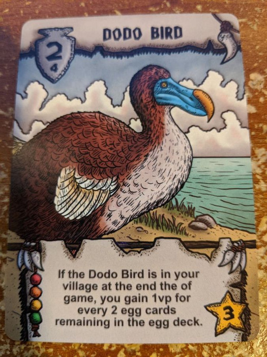 Card text: "If the Dodo Bird is in your village at the end the of game [sic!], you gain 1vp for every 2 egg cards remaining in the egg deck."