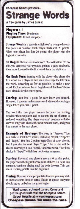Strange Words was published (without the word list) in the Origins 2000 preregistration book. It was included in Chief Herman's Holiday Fun Pack.