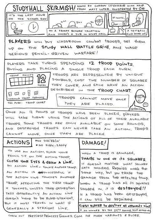 It’s the last hour of the school day, on a Friday, before a vacation, and there’s a substitute teacher in study hall. Of course a spitball fight breaks out … Players will buy classroom combat troops, set them up on the study hall battle grid, and wage furious pencil driven warfare!
