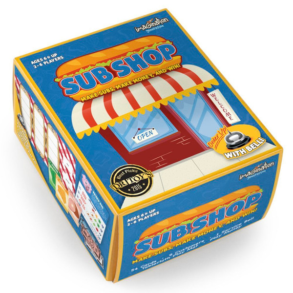 In Sub Shop, the game of competitive sandwich construction, use 8 ingredients to build 11 unique sandwiches to fill the picky and particular orders of 9 zany customers! Draw a customer card, read out their order, then lay your ingredient cards onto the real tablecloth game board. When you complete the whole order, ring the kitchen service bell, shout "Order up!" and collect your tip!