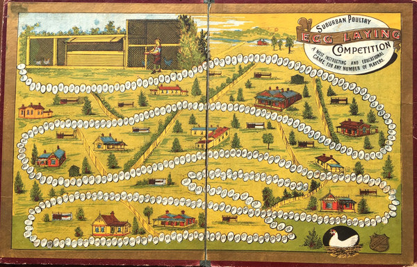 Simple roll-and-move game designed to show early 20th century everyday life in outer suburban Australia. The game has 365 spaces where players traverse across semi rural land dotted with Victorian era housing and chicken coops.
