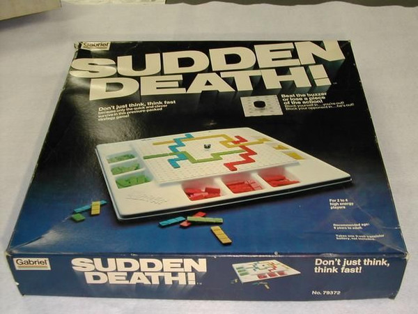 Sudden Death is a surround placement type of game. During your turn you place down 1 of 3 different plastic pieces made up of either two, three or four squares. The board consists of 441 squares and each player starts on his own side. The object is to block the other players to prevent them from playing any more pieces. You are allowed to jump over one square. To speed up game play, the designers included a button connected to a 9-volt battery and to a timer in the middle of the board. The button slowly rises and after a certain number of seconds, a buzzer goes off. If the buzzer goes off, you pay a penalty of losing 2 two-square pieces. The timer can be set to go either quickly or slowly.