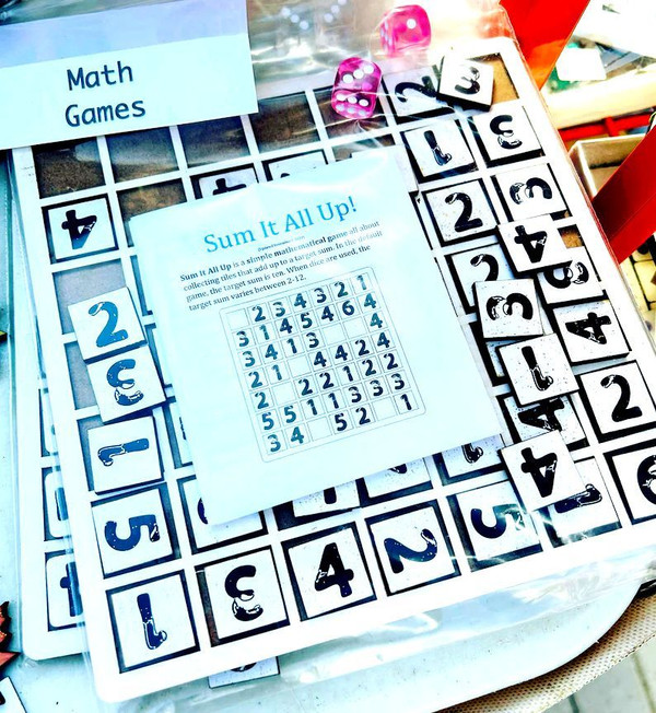 Sum It All Up is a strategic yet simple mathematical game. The game is about collecting tiles that add up to a target number. In the default game, the target sum is ten. When dice are used, the target sum varies between 2-12.