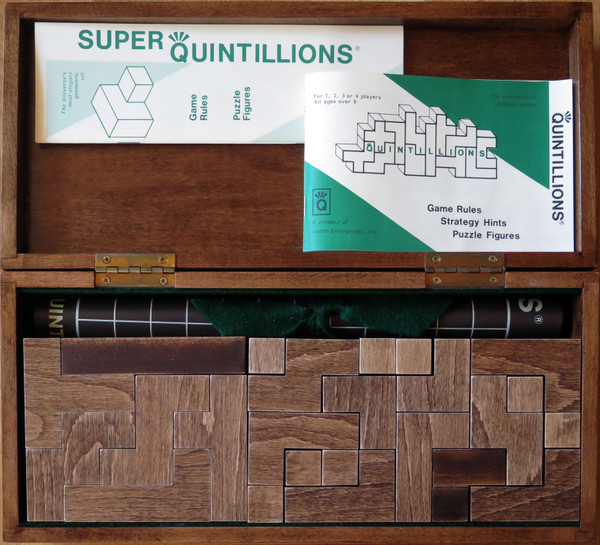 This is undeniably our finest product. The combined Quint/Superquint set is handcrafted and lasercut from a single piece of beautiful maple for an incomparable matched-grain look. All 30 pieces form a block in their custom-fitted hardwood case. An extraordinary pleasure to own or to receive, the deluxe combo is frequently given as graduation gift, wedding present or executive award. The box includes a leather-like vinyl game mat and both booklets. For 1 to 6 players, ages 12 to adult.