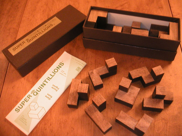 This is the expansion set to Quintillions. It contains an additional 18 non-flat 5-cube pieces ("pentacubes"). With this expansion you can make even more puzzles and larger game versions become possible. Booklet includes puzzles and games that combine just the 18 expansion pieces and all 30 pieces total. There is an optional case that stores the pieces from both Quintillions and Super Quintillions in one carry case available from Kadon Enterprises for $50 USD.