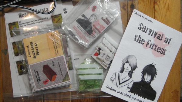 Intended as a party game, Survival of the Fittest mixes together hand-management and bluffing of Bang! with the second guessing and alliances of Werewolf, bringing in up to 12 players to play as twelve of the fourteen unique characters which are dealt out randomly (along with a starting weapon) to the players.