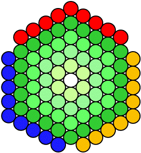The board consists of blue, red, and yellow borders, as well as concentric rings, each a different shade of green. The central space is also considered a “ring”, even though it’s just one space.
