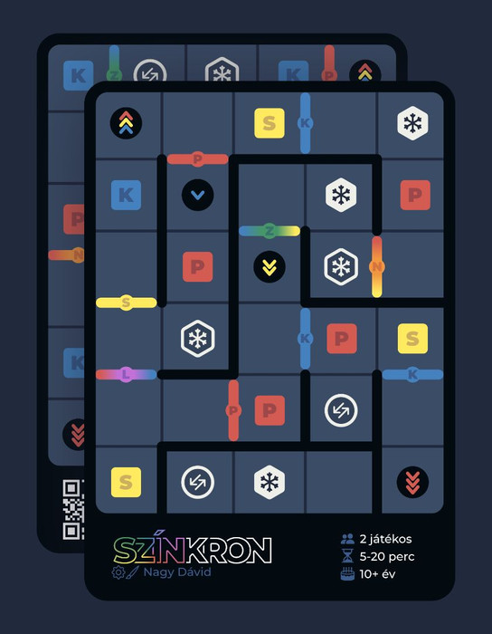 Színkron is a cooperative puzzle game for two players that can be played without a playing surface — while holding it in hand. The only component is a double-sided card. Players progress along their own paths in sync, aiming to complete three increasingly challenging levels by reaching the target spaces on both sides.