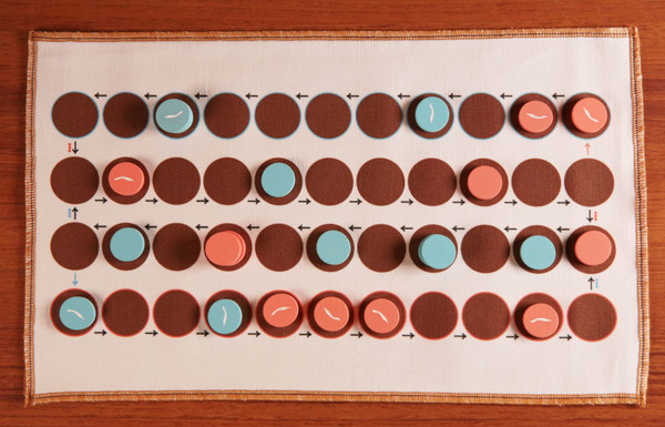 The game is played on a board with 4 rows and anywhere from 7 to 15 columns. One player fills the bottom row with playing pieces; the other player fills the top row with his or her pieces. Four casting sticks are used to randomly generate moves for the pieces. The two center rows of the board are treated as a looping track along which pieces move linearly in a counter-clockwise direction once leaving their home row. It is primarily on these two central rows that the battles take place, with a piece capturing an opponent piece by landing on its square. A few special movement rules add complexity and strategy to the game. A player wins by capturing all of the opponent's pieces.