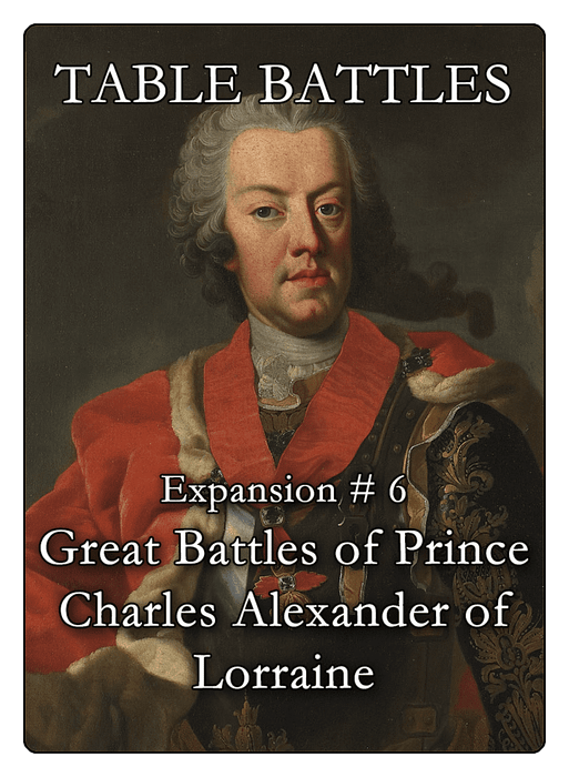 Great Battles of Prince Charles Alexander of Lorraine is the sixth expansion to Amabel Holland's Table Battles, taking as its subject the not-exactly illustrious career of its namesake. Oh, the six battles in this set are "great" battles, including some of the most famous engagements of the eighteenth century. But they're not famous because of Charles, who is widely regarded as one of the worst commanders in history. They're famous because of guys like Frederick the Great and Maurice de Saxe, who ran circles around our boy Chuck, inflicting one humiliating defeat after another. Of course, the battles didn't have to end the way they did, and perhaps with your skill and a little luck, the outcomes might be very different!