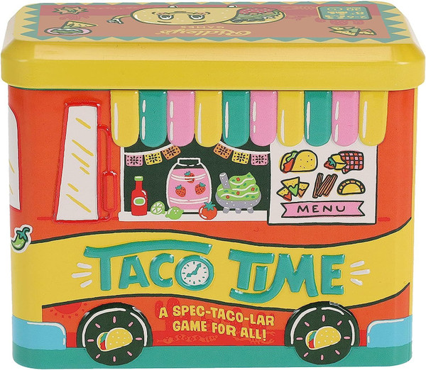 Taco Party is a dice-rolling, push-your-luck game by Ridley's Games for 2-6 players aged 8+. Players roll dice to collect food and drink cards by matching the correct ingredients to the dishes they want to make. The more correct ingredients they roll, the harder it will be for other players to challenge them. However, rolling too many wrong ingredients can cause players to lose their card. Each food card collected earns points, with bonus points for completing a whole meal. The winner is the player with the highest-scoring cards in their pile. Taco Party is suitable for friends, families, and anyone who loves tacos. It comes with 32 food cards, 12 drink cards, 8 ingredient dice, and instructions, and has an average gameplay time of 30 minutes. Printed using FSC paper and with soy inks.
