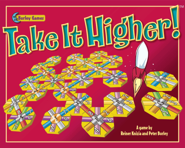 Take it Higher! takes "Take it Easy!" as a basis and adds three new elements. First of all, the tiles are octagonal, with four scoring lines running through them (instead of three). Secondly, the center of the tiles are either silver or gold giving you additional bonus points once you score a colored line where all the tile centers are silver or gold (9/10 bonus points per tile). Finally, when you complete a colored line, you might be able to put a rocket ship of the corresponding color on the tile you just placed. These rockets are available from the start of the game on numbered circles on the individual playing boards. At the end of the game you will receive bonus points for the highest empty space that has no rocket ships lower than it.