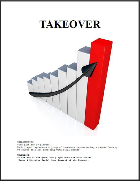 "Card game for 2+ players. Each player represents a group of investors trying to buy a target Company. Of course they are competing with rival groups."