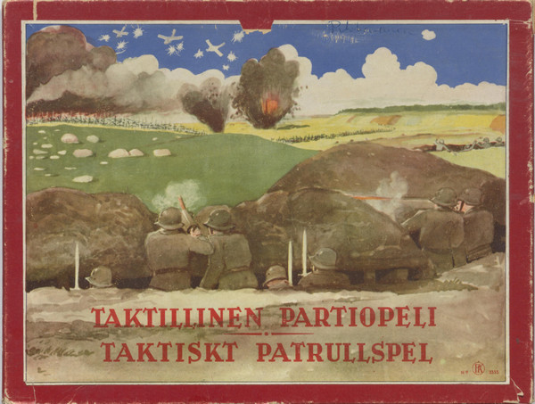 Simple tactical wargame of two identical forces of contemporary military units on cardboard standees trying to capture the other side's headquarters (flag piece). Played on a map where pieces can only move along roads and foot paths shown in three different colors that allow units to move one to three steps per turn. Combat is deterministic with either the attacked piece being eliminated or both pieces depending on the types of pieces involved. Barbed wire can be used to block enemy movement. Each side's forces includes two demolition units that can destroy any enemy piece (including barbed wire) at the cost of itself also being destroyed. They can also be used to demolish any of the five bridges shown on the map and red wooden pawns are included in the game to mark bridges that have been destroyed.
