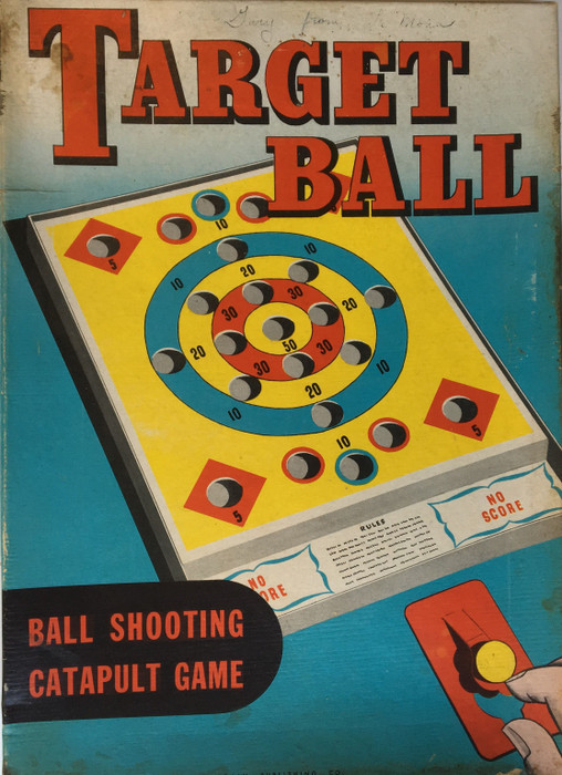 This game consists of a target board inset into the box, a 3.75" long metal spring catapult, and three wooden balls about 3/4" in diameter. Holes designed to fit the balls are cut into the cardboard target at various points.