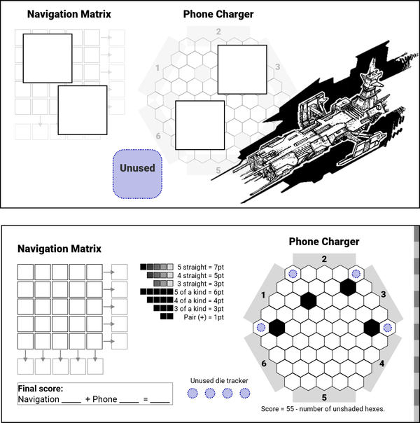 In this roll and write game, players are interfacing with an escape pod terminal. Over twelve turns, they will use dice to put numbers into the Navigation Matrix and power up the Phone Charger. At the end of the game, the player who has most efficiently completed these tasks is the winner.