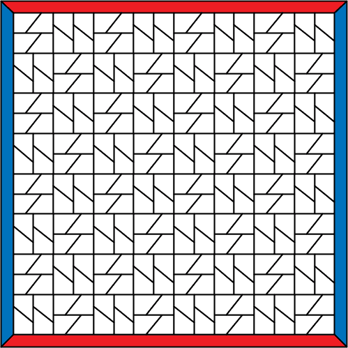 Tex is a drawless connection game for two players: Red and Blue. It is played with trapezium-shaped pieces on the spaces of an initially empty, loosely square grid. The top and bottom edges of the board are colored red; the left and right edges are colored blue.