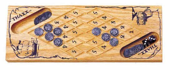 "THAXX features a solid oak ship's plank, authentic replicas of the Elcazador's Lost Treasure and a historical game in which you attempt to plunder the loot of your opponent. The game of Thaxx seems as though it was ripped from the deck of the great ship and into your hands. Thaxx is easy to learn with fast paced game play for ages 6 and up."
