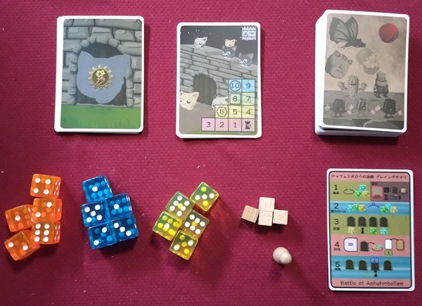ã¢ããã§ã³ããã¦ã®æ±ºæ¦ (The Battle of Apahehmbollaw) is a single-player game in which you roll a die each round and assign it to a gate to create a hand to defeat the enemy facing the gate and defend the city of Apahehmbollaw.
