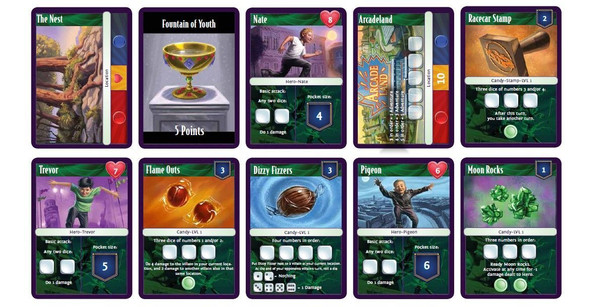 On your turn, roll dice to create specific combos in order to activate your candies’ abilities and to accumulate Adventure tokens on a Location. The first player to get the necessary amount of Adventure tokens on a Location wins the Artifact hidden behind it and scores points. But beware the Villains that stand in your way! If there’s a Villain at your current Location, he can damage or incapacitate you. If your health falls to zero, you will lose points. If you manage to beat a Villain’s health to zero, you will receive Reward cards equal to its level. You only get to keep one Reward card, however, so choose wisely, whether it be extra points or potent power-ups. The first player to reach 15 points is declared the winner.