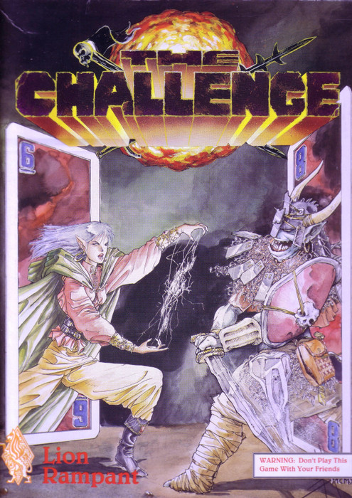 The Challenge is a card game of deadly combat and formidable magics. (It is clearly a knockoff of Mayfair's Encounters, though it never mentions that fact.) Action is fast paced and tension-filled as characters exchange blows, fire spells, and even attempt to backstab. It is the fantasy battle at its best.