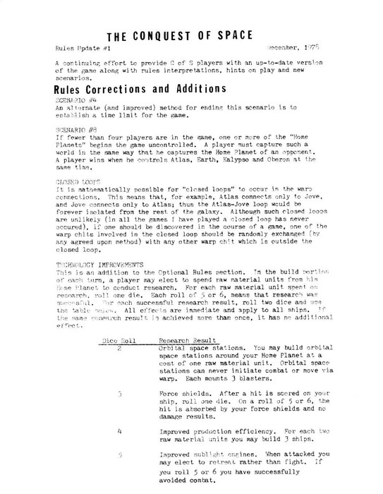 A rare four-page rules update for the independently produced boardgame The Conquest of Space. The update includes new scenarios, rules corrections, and variant rules.