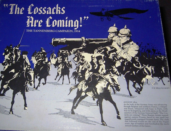 The Cossacks are Coming! is an operational simulation of the World War I Tannenberg campaign in which Russian and German armies battled during August and September of 1914. The game uses weekly turns (each composed of a variable number of impulses), a map scale of five miles per hex, and battalion to brigade level units to portray the conflict. Aspects of the campaign covered by the rules include artillery, limited intelligence, reconnaissance, command control, supply, morale, and prisoners of war.