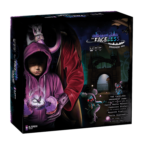 The Faceless Amusement Park is the first dungeon crawler with compass and magnets. The main Characters are teenagers and the Action Wheel represents the difficulty of acting in certain situations of its protagonists. What will happen, turn by turn, can be conditioned by the magnetic force on the Action Wheel. Miniatures with magnets have a positive side and a negative side which will influence the movement of the Compass in the center of the Action Wheel.