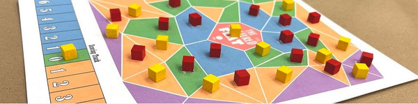 Players take turns placing or moving their tokens on the board. You score points by occupying regions with dots (“cities”), and you also score points if neighboring regions are owned by your opponent. Each game takes 10 to 15 minutes.