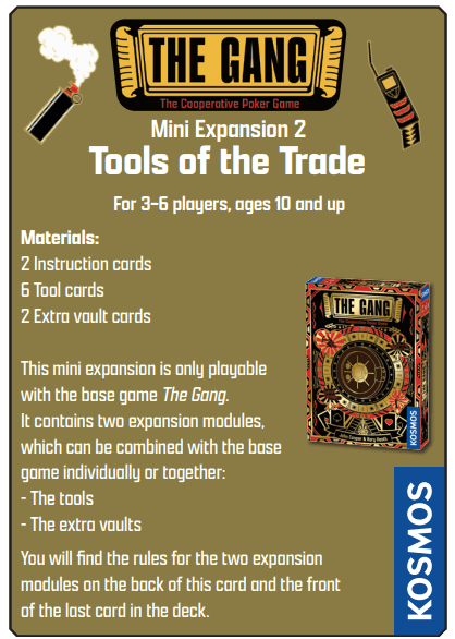 Gear up and get ready for the hardest heist yet! The Gang: Tools of the Trade replaces the specialists of the base game with a special tool for each player at the beginning of play. These tools are private information, and each member of the team must determine on their own when their tool will be the most useful.